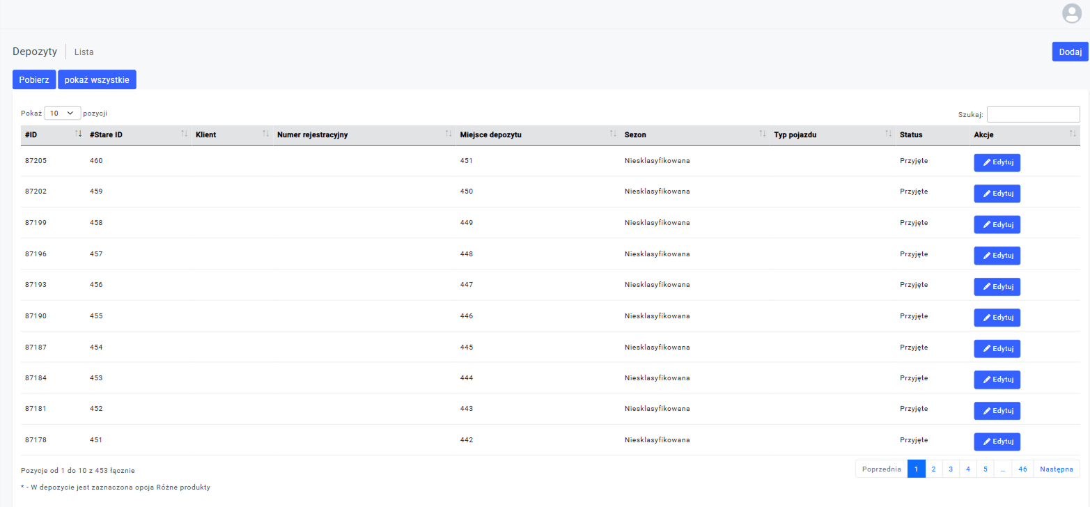 Koniec z chaosem w przechowywaniu opon! W Serwis500 masz pełną kontrolę nad depozytami – łatwo dodawaj, edytuj i organizuj depozyty klientów, drukuj etykiety i zarządzaj umowami przechowywania.